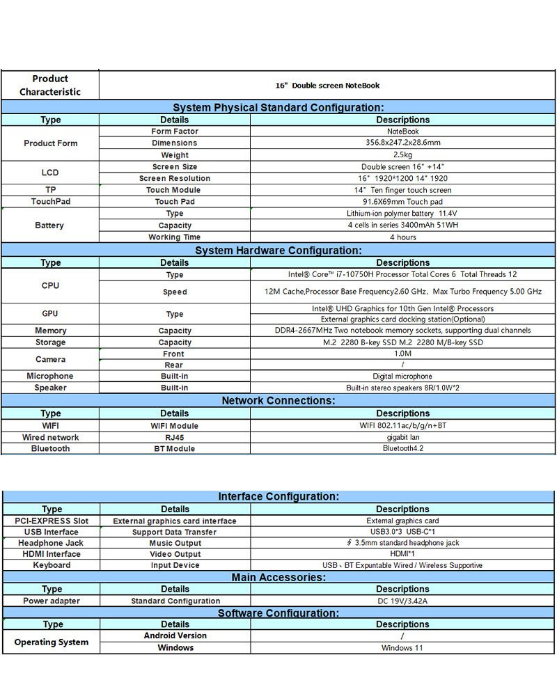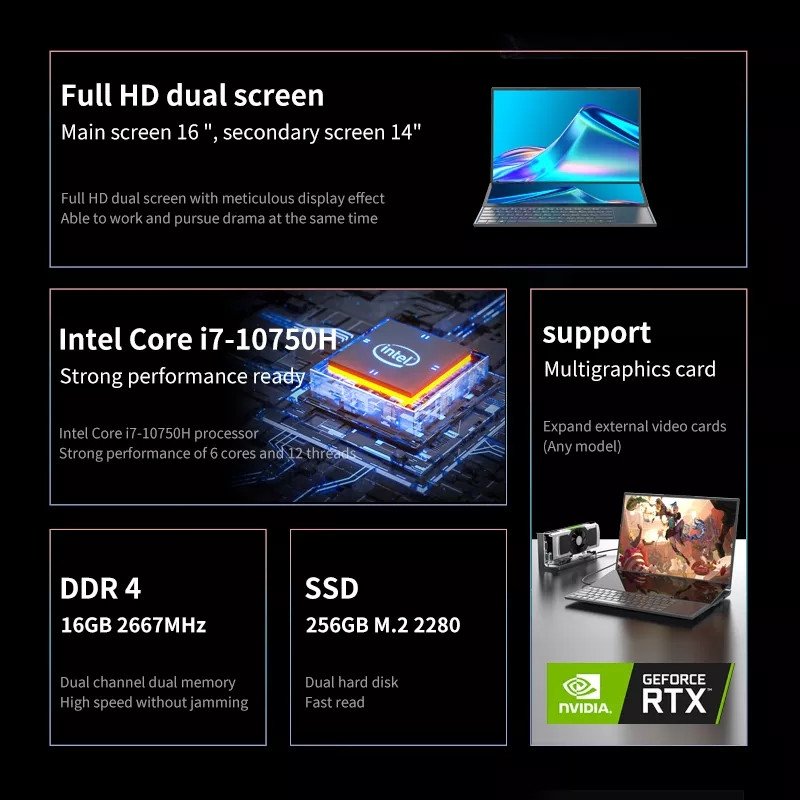 Gaming Laptop Notebook BEEX Core i7 10750H Dual Screen, 16 Inch & 14 Inch Touch Screen HD, DR4 Windows 11